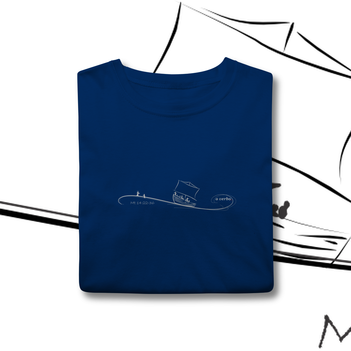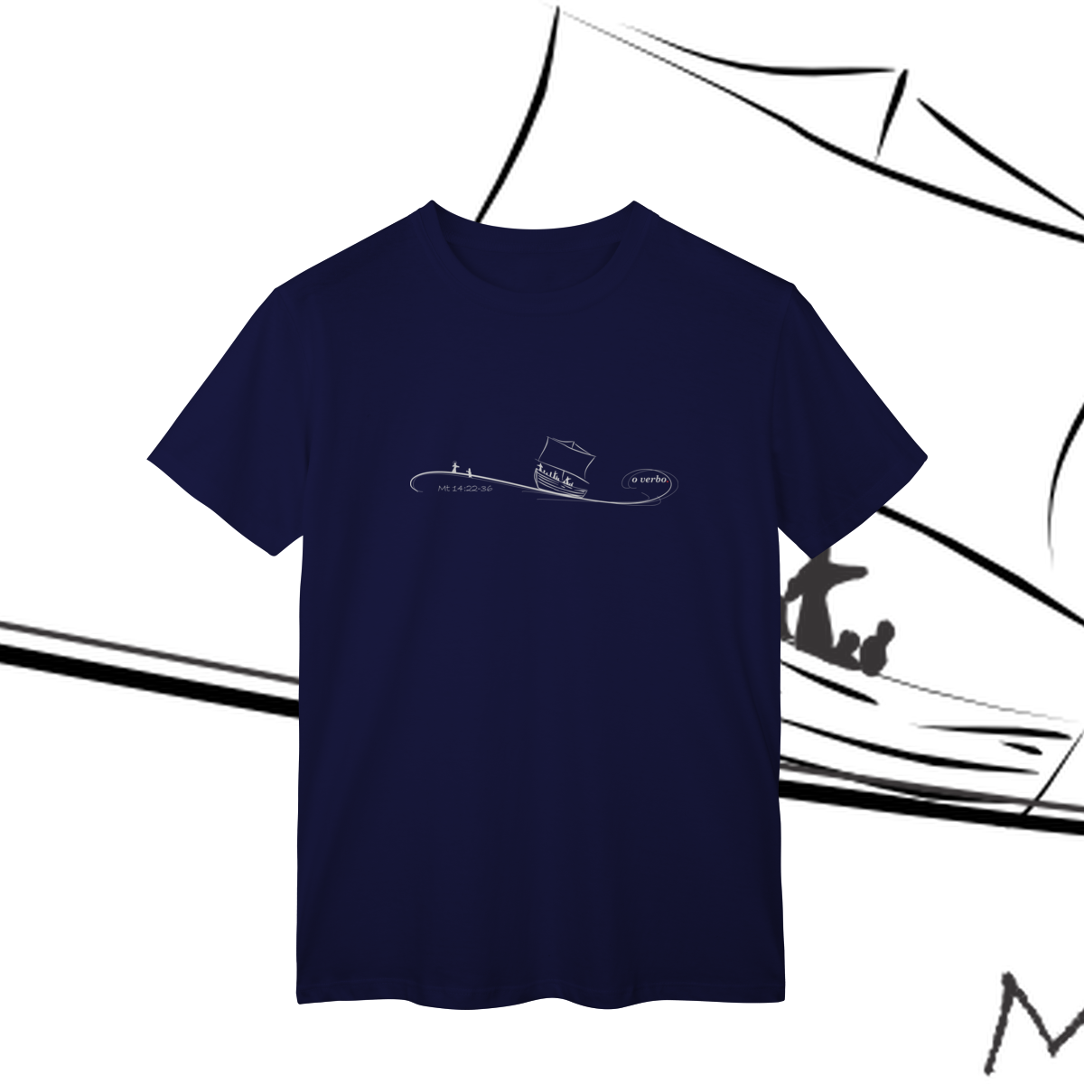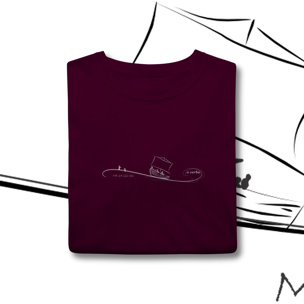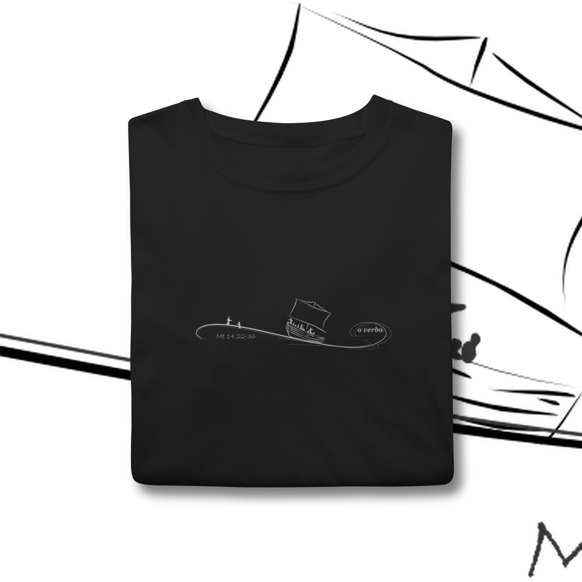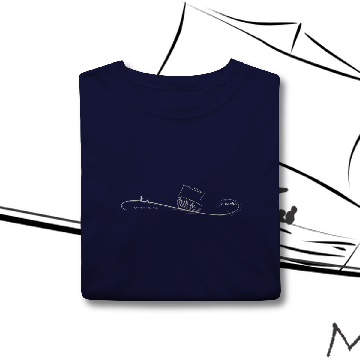 A linha contínua retrata Jesus, Pedro e o barco em Mateus 14:22–36, lembrando que mesmo quando os ventos sopram forte, Cristo continua sendo o chão firme sob nossos pés.