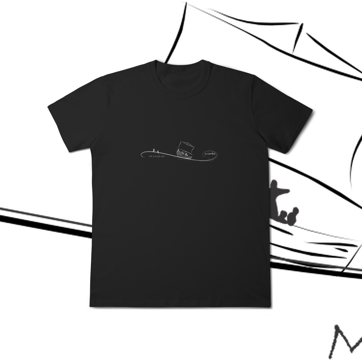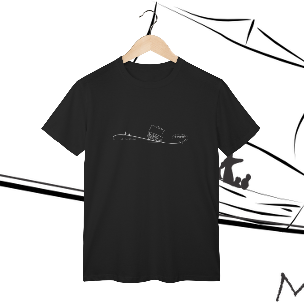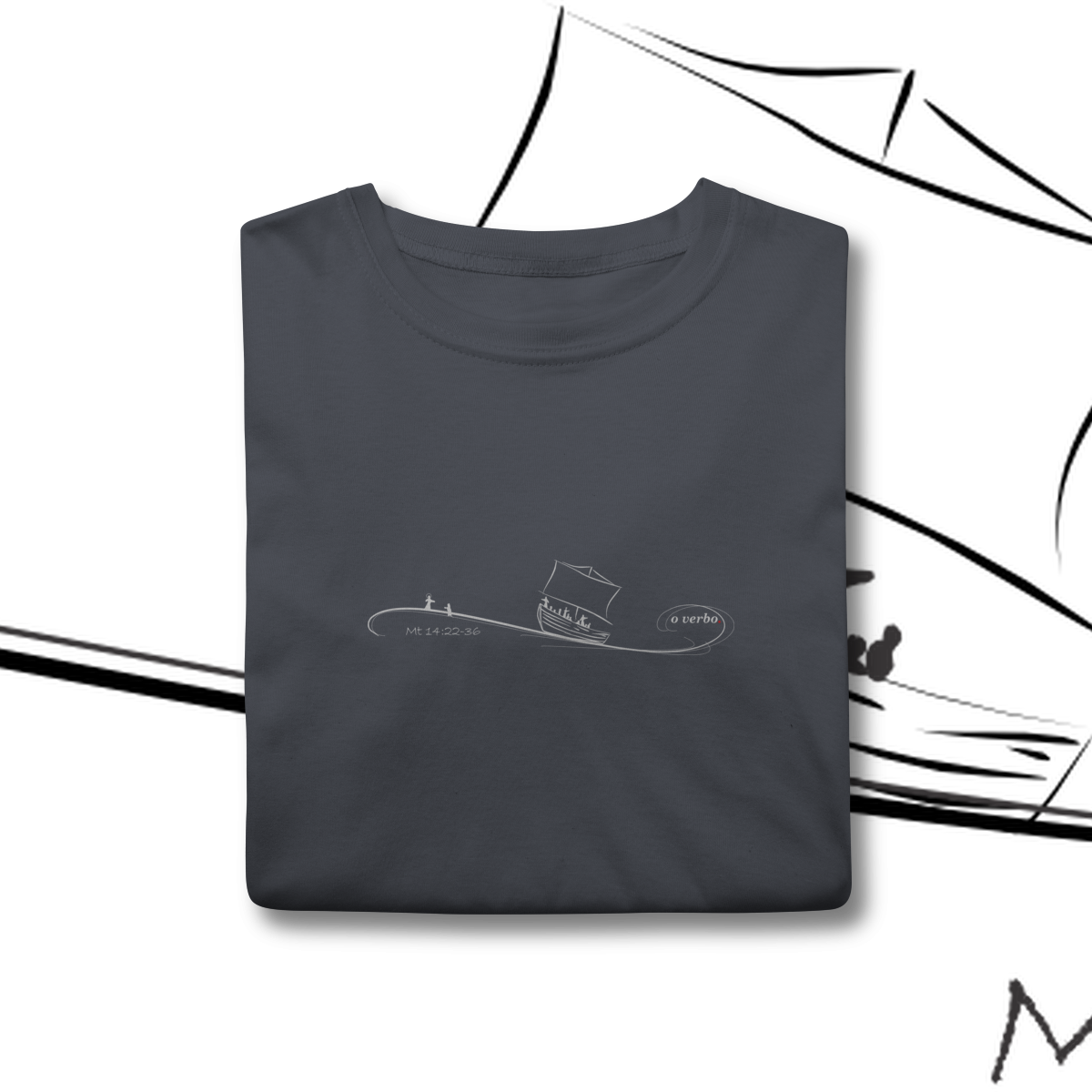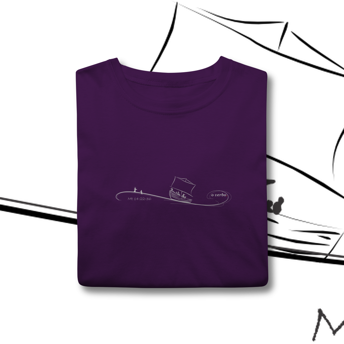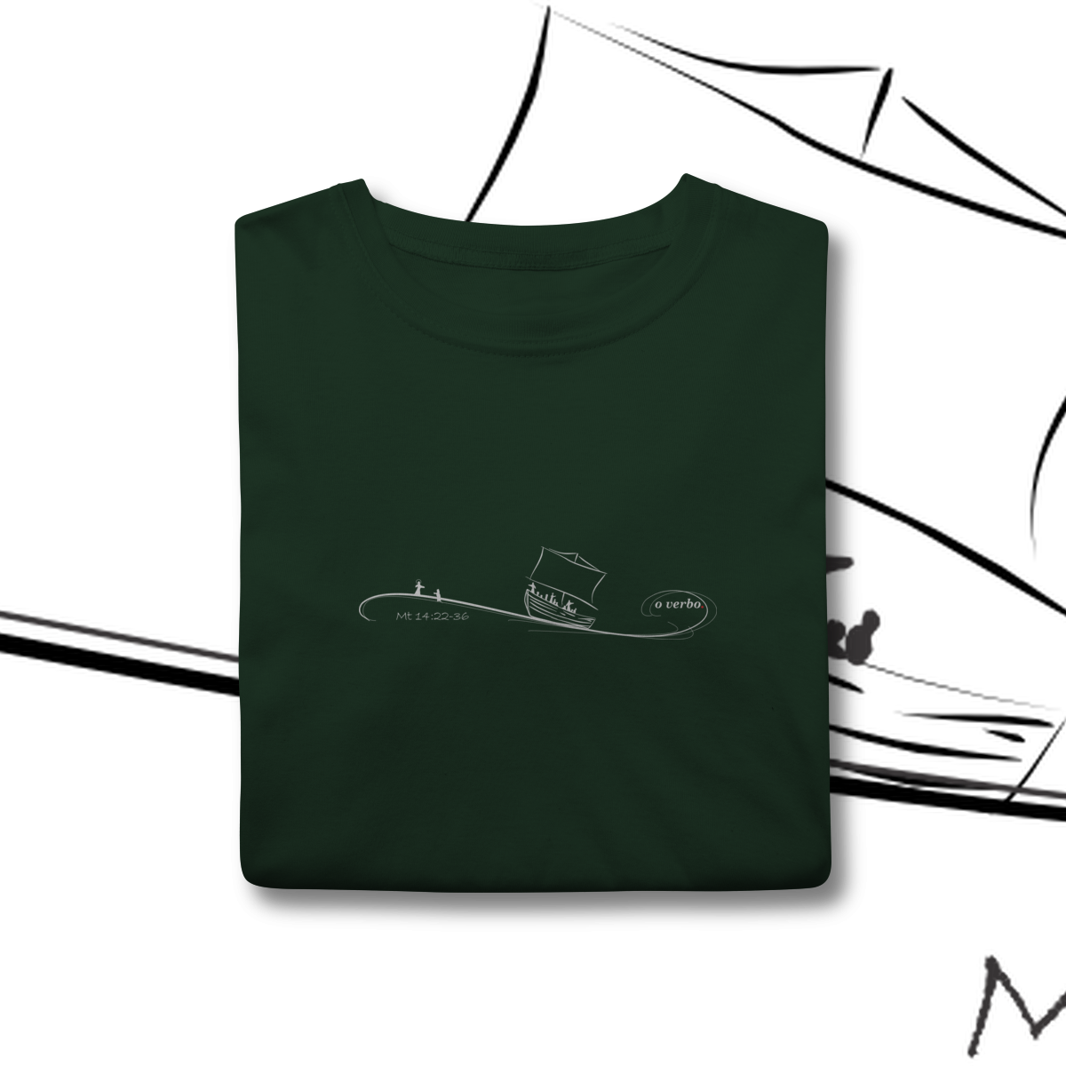 A linha contínua retrata Jesus, Pedro e o barco em Mateus 14:22–36, lembrando que mesmo quando os ventos sopram forte, Cristo continua sendo o chão firme sob nossos pés.