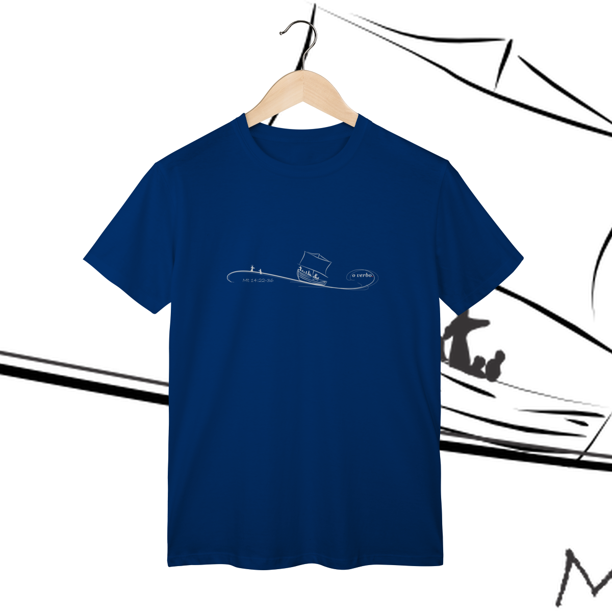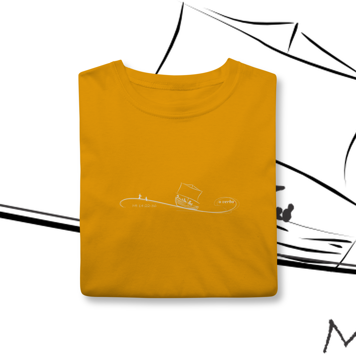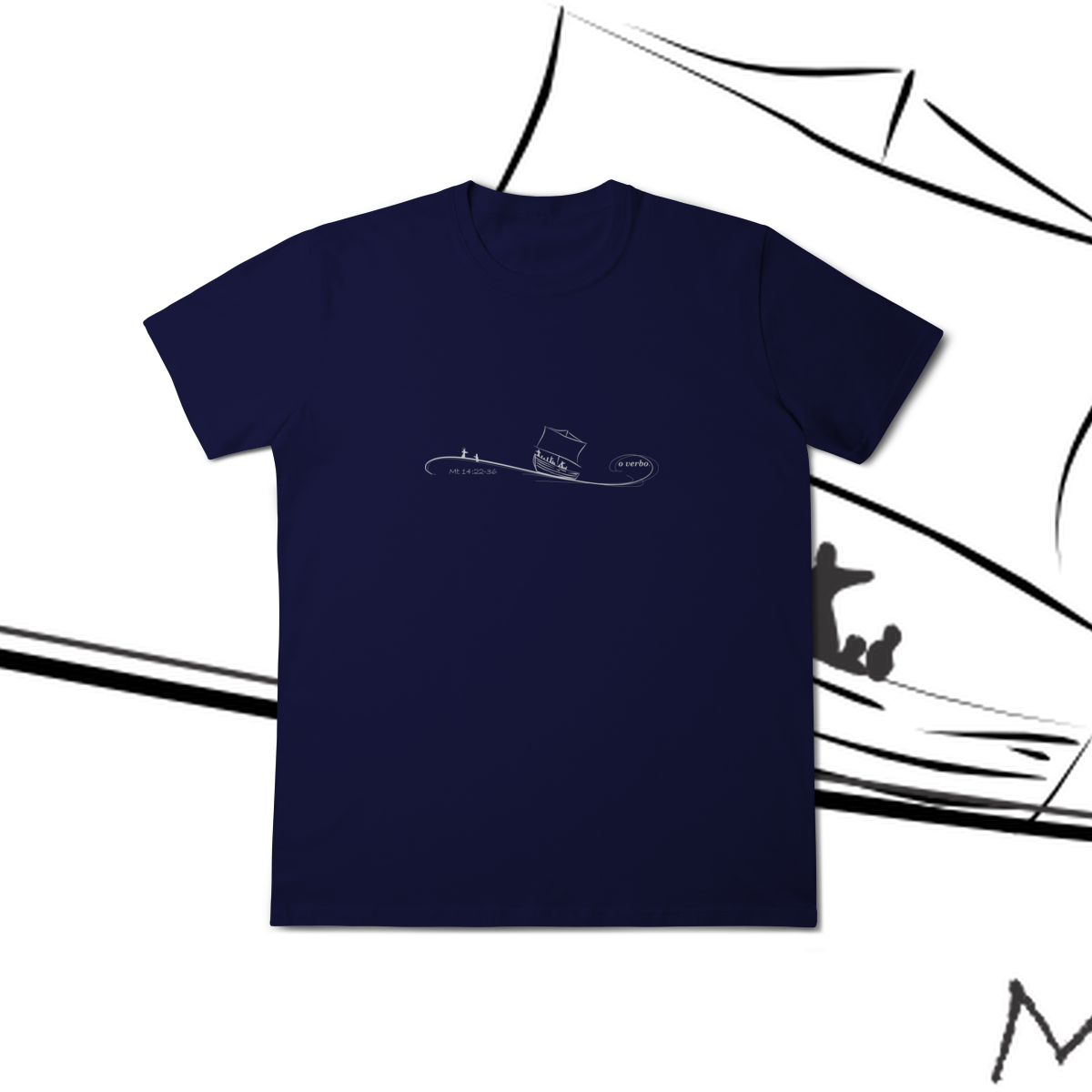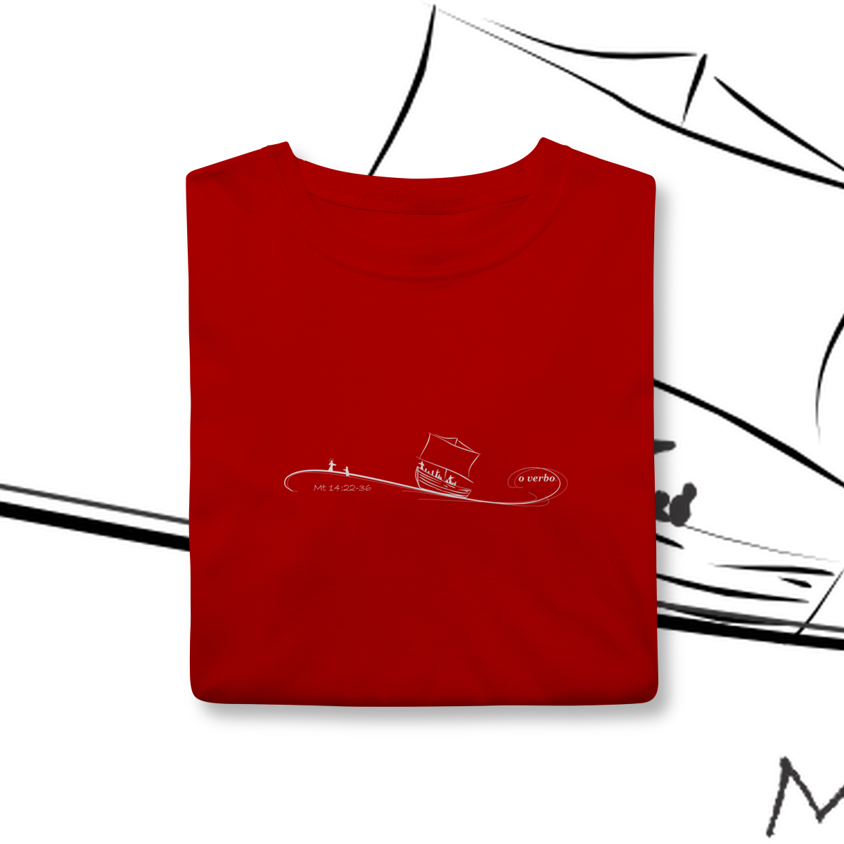 A linha contínua retrata Jesus, Pedro e o barco em Mateus 14:22–36, lembrando que mesmo quando os ventos sopram forte, Cristo continua sendo o chão firme sob nossos pés.