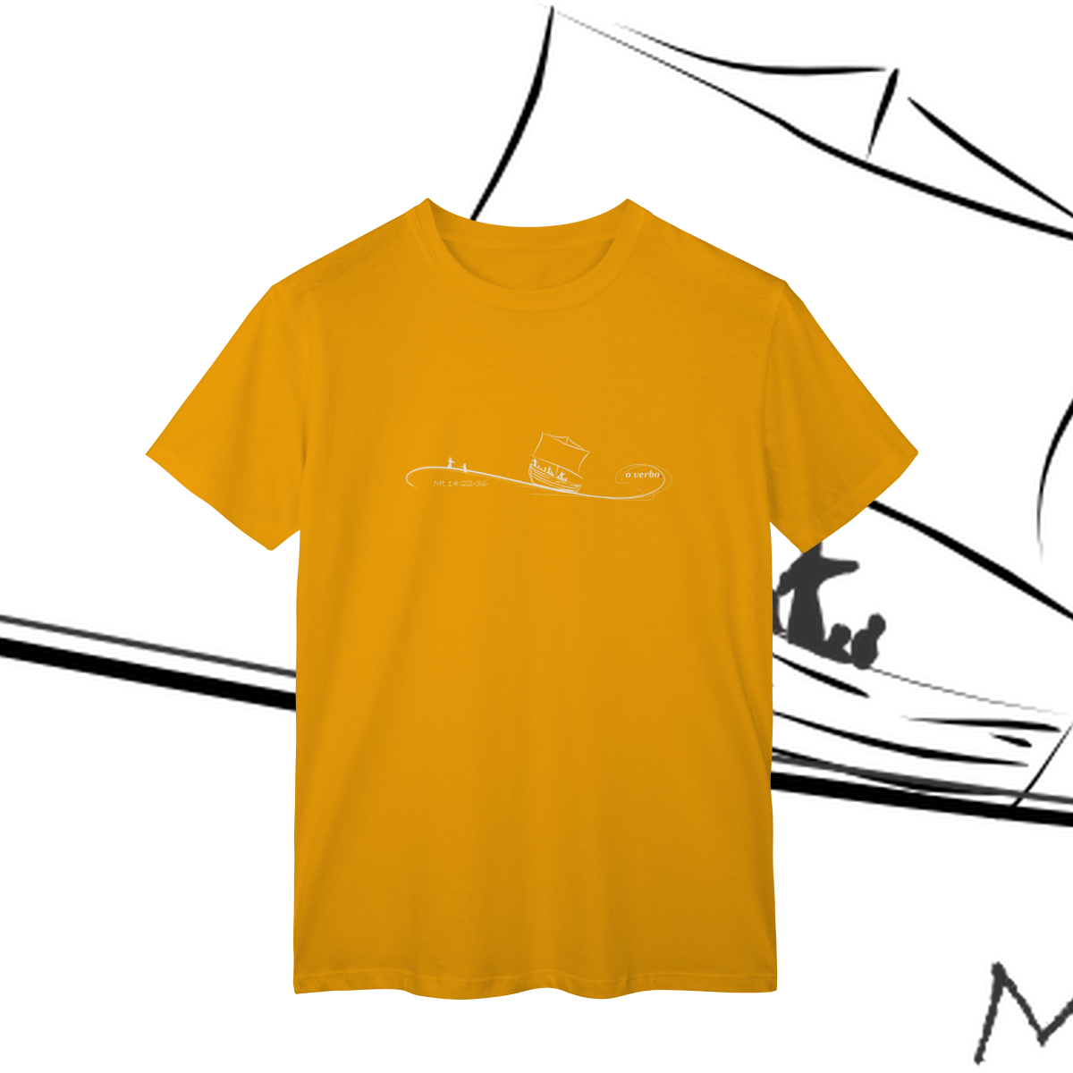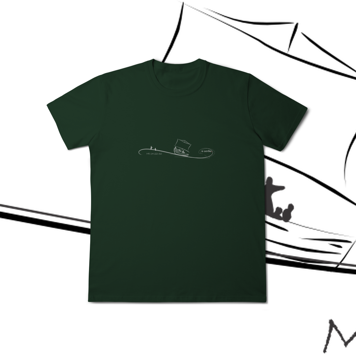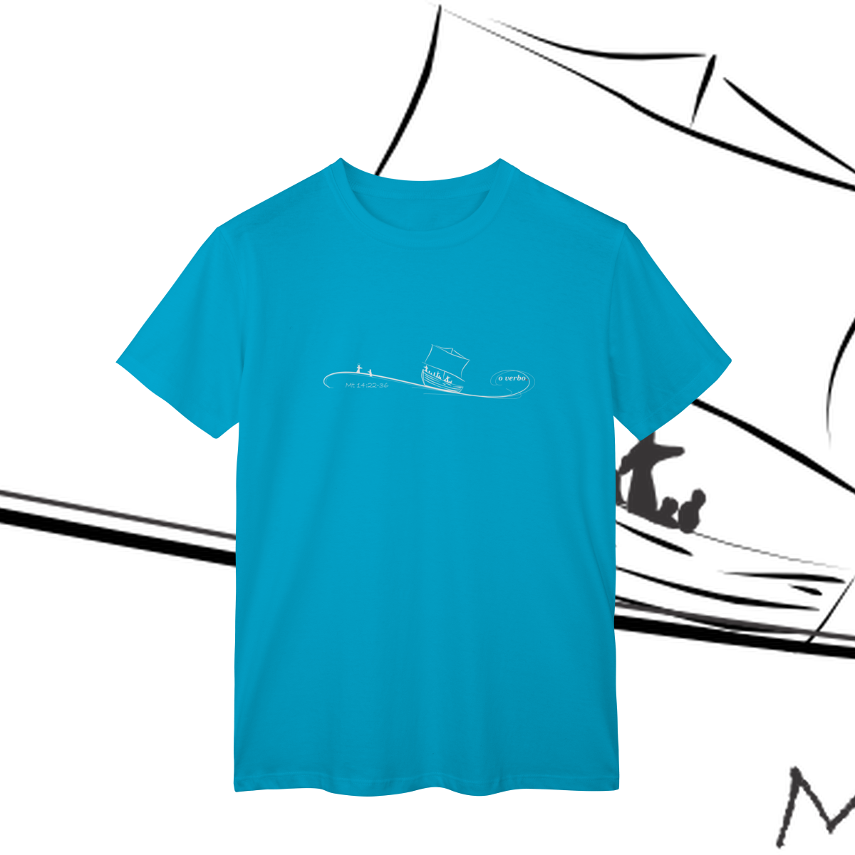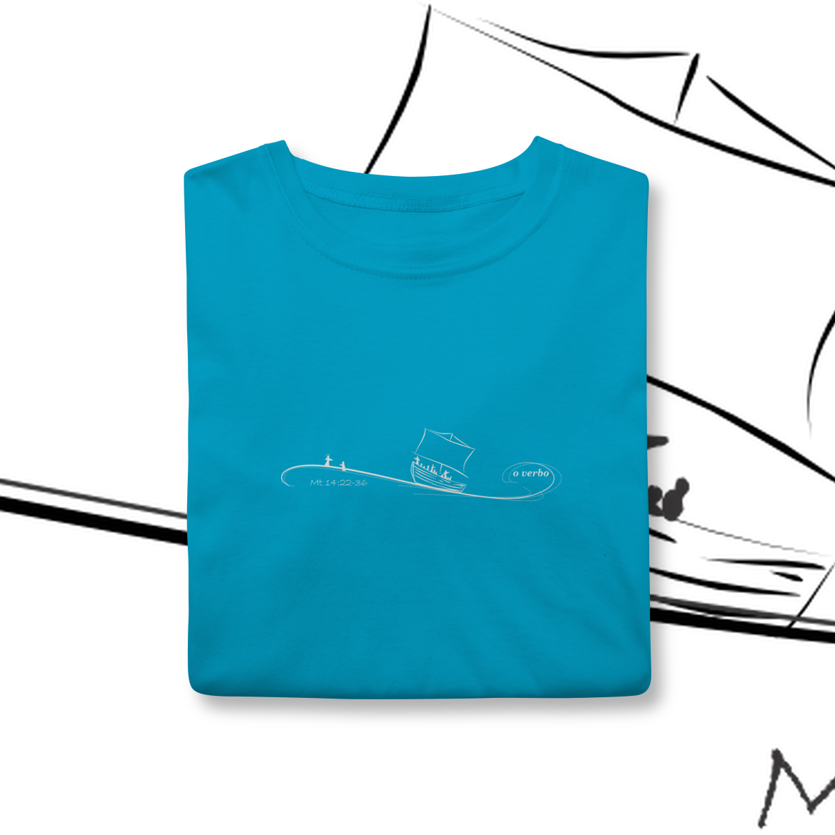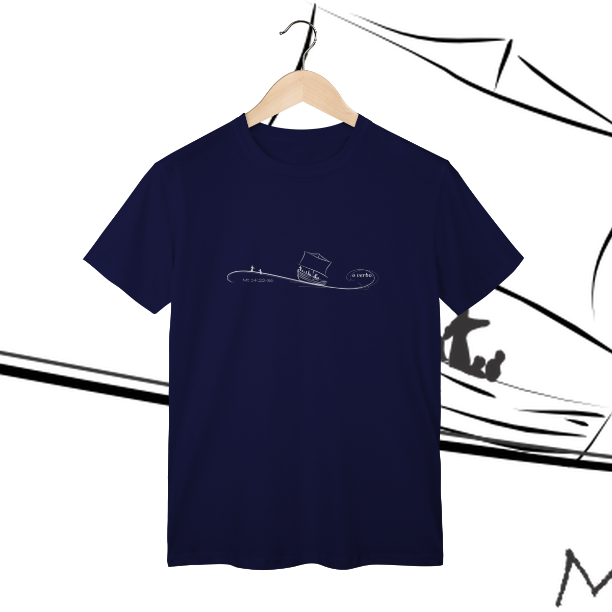 A linha contínua retrata Jesus, Pedro e o barco em Mateus 14:22–36, lembrando que mesmo quando os ventos sopram forte, Cristo continua sendo o chão firme sob nossos pés.