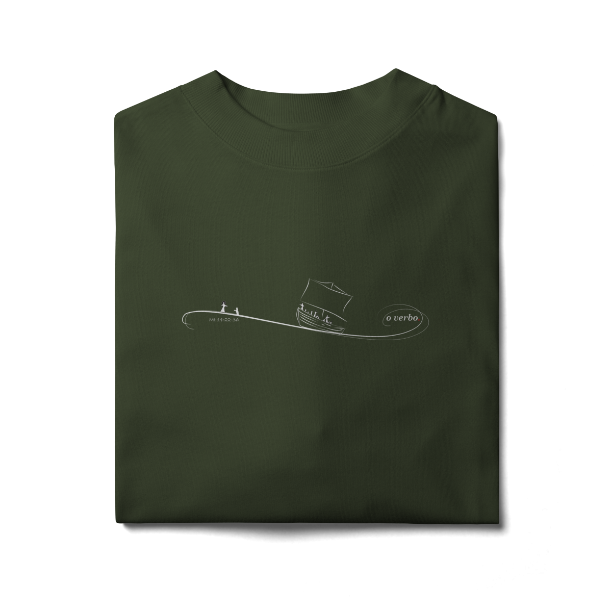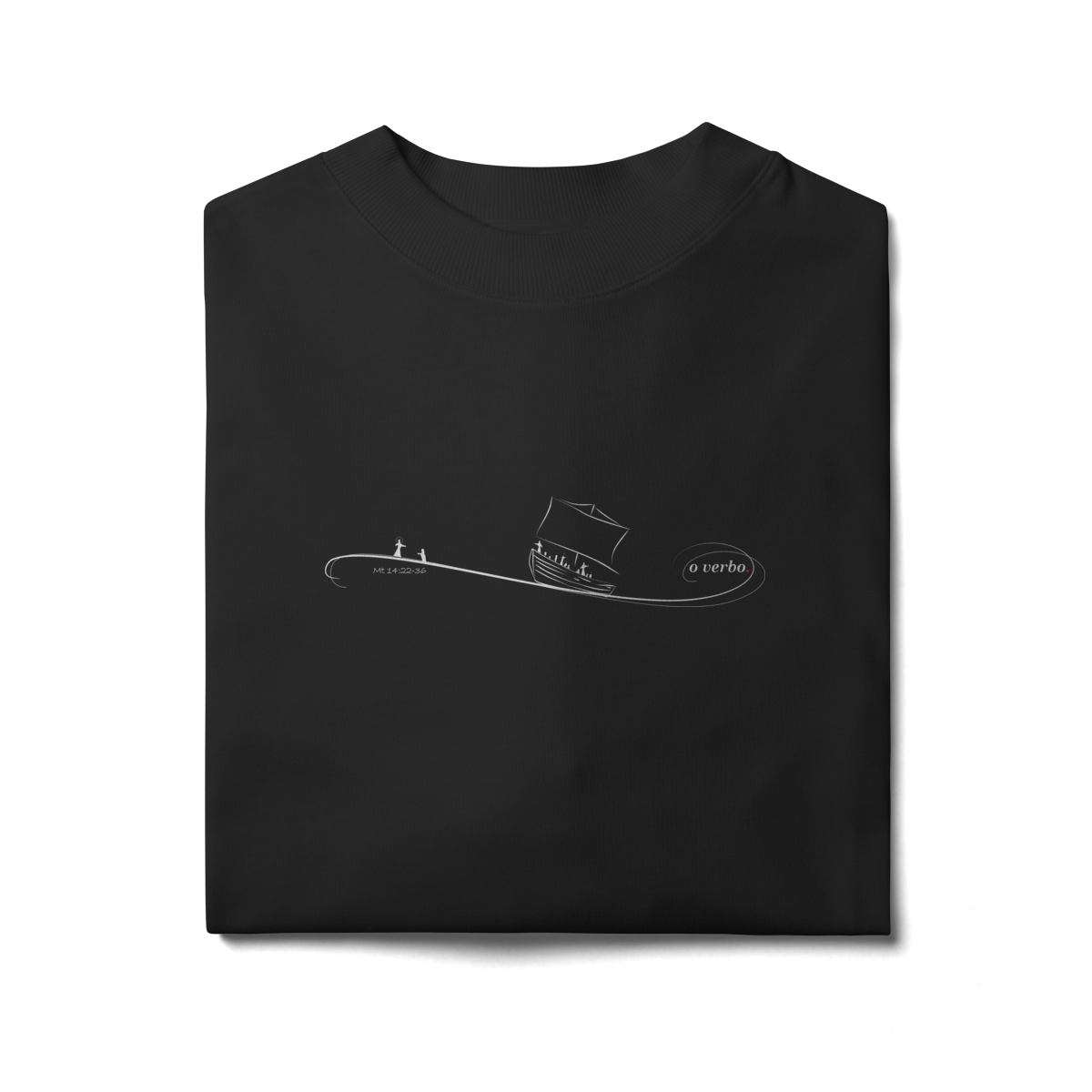 A Camiseta Oversized Jesus e Pedro sobre as Águas traz uma arte exclusiva e minimalista inspirada em Mateus 14:22-36, o encontro transformador de fé em meio à tempestade.
