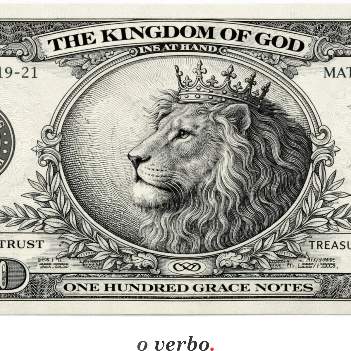 O Leão de Judá ocupa o lugar de autoridade, cercado por símbolos do Reino, remetendo à graça, à eternidade e ao valor que não se perde com o tempo.