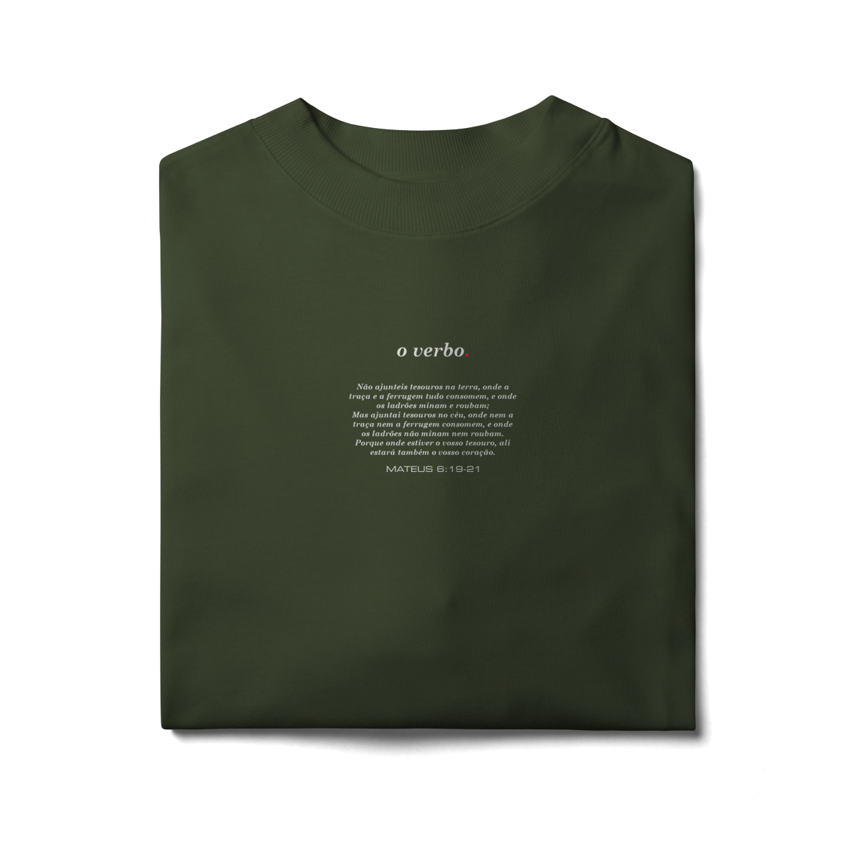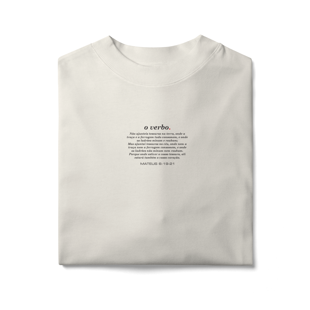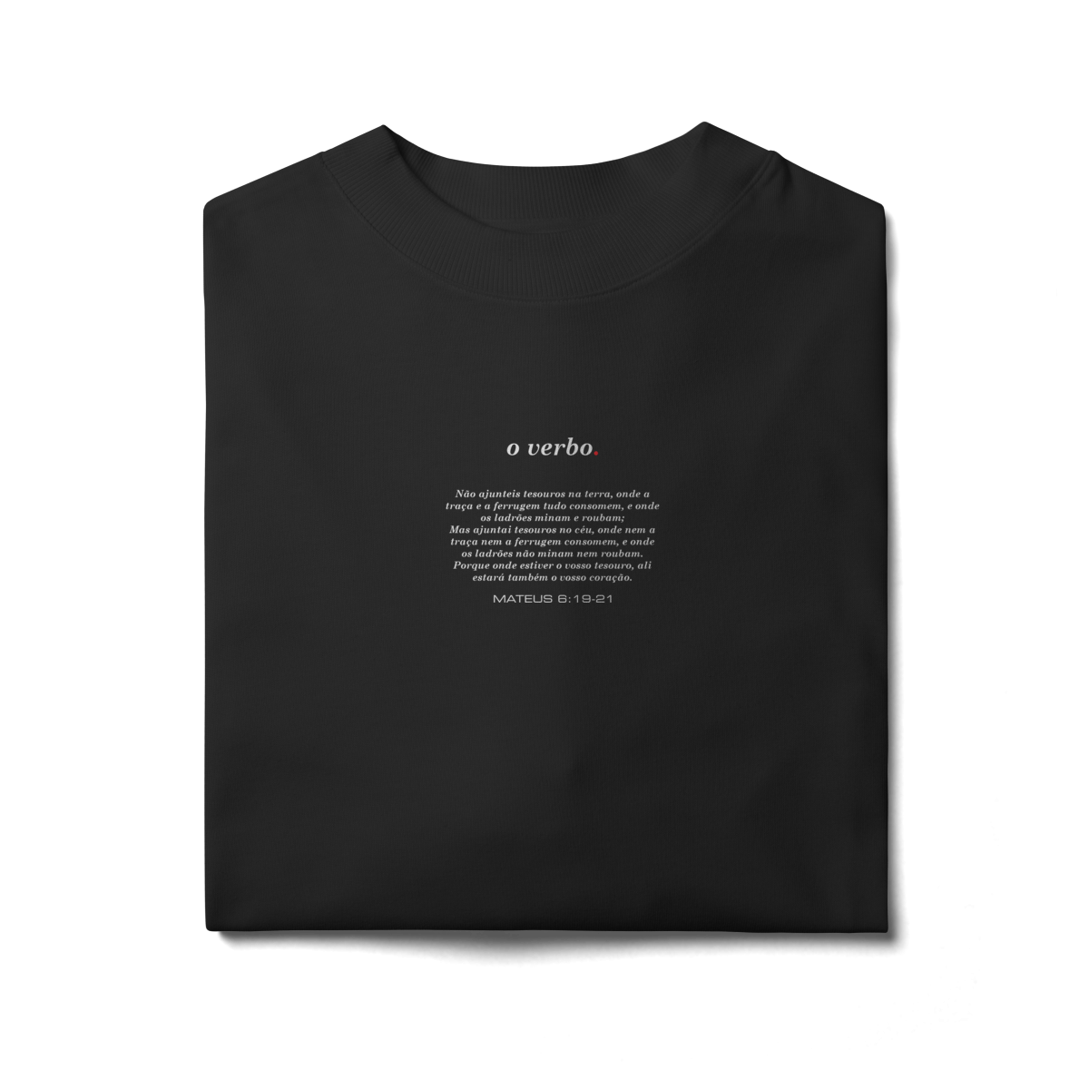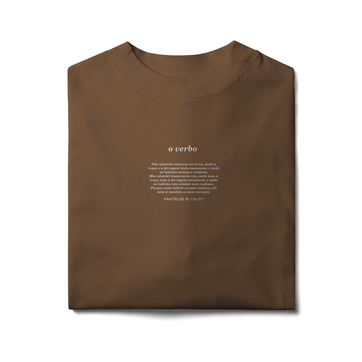 Na parte frontal, de forma discreta e elegante, o versículo Mateus 6:19–21 convida à reflexão sobre onde colocamos nosso coração e nossa verdadeira confiança.