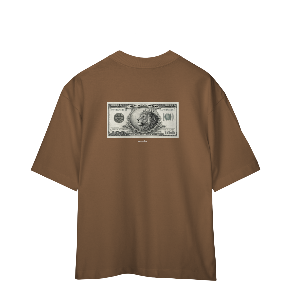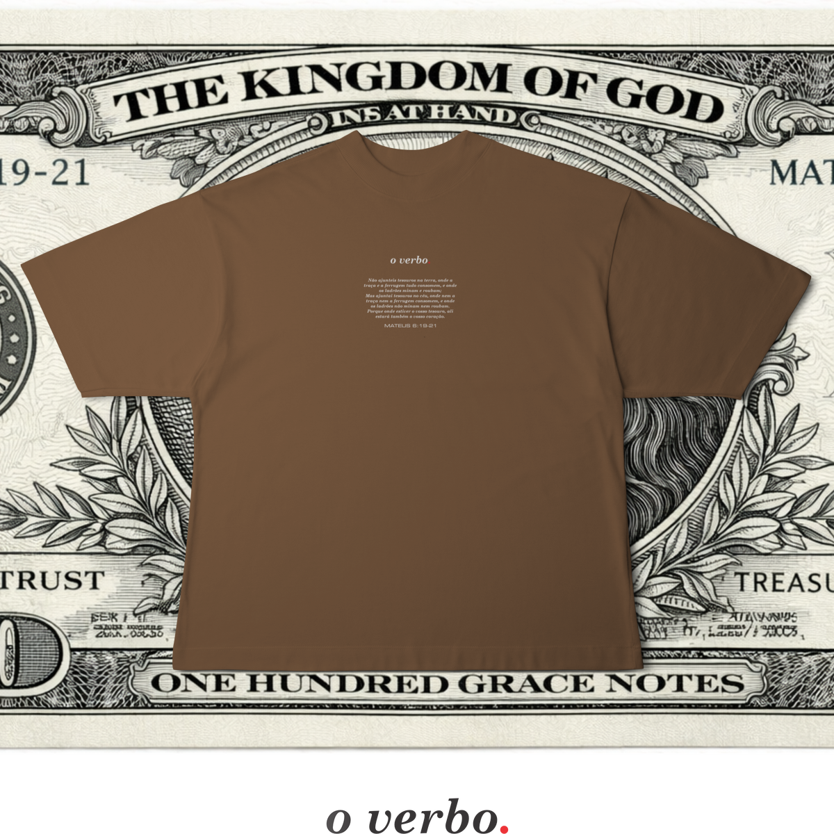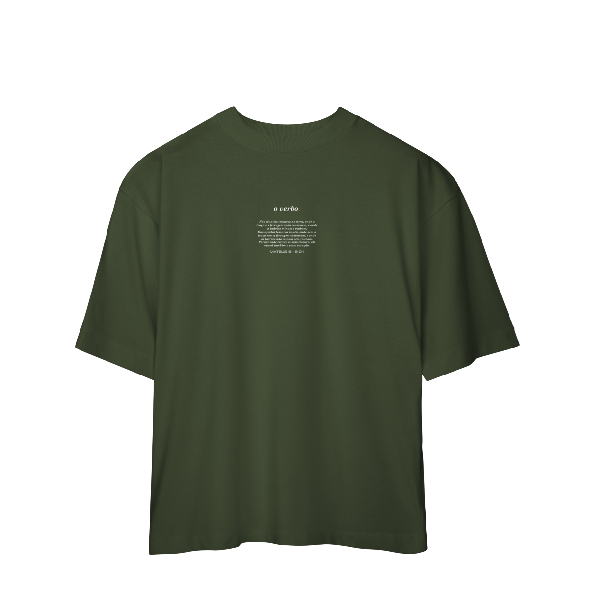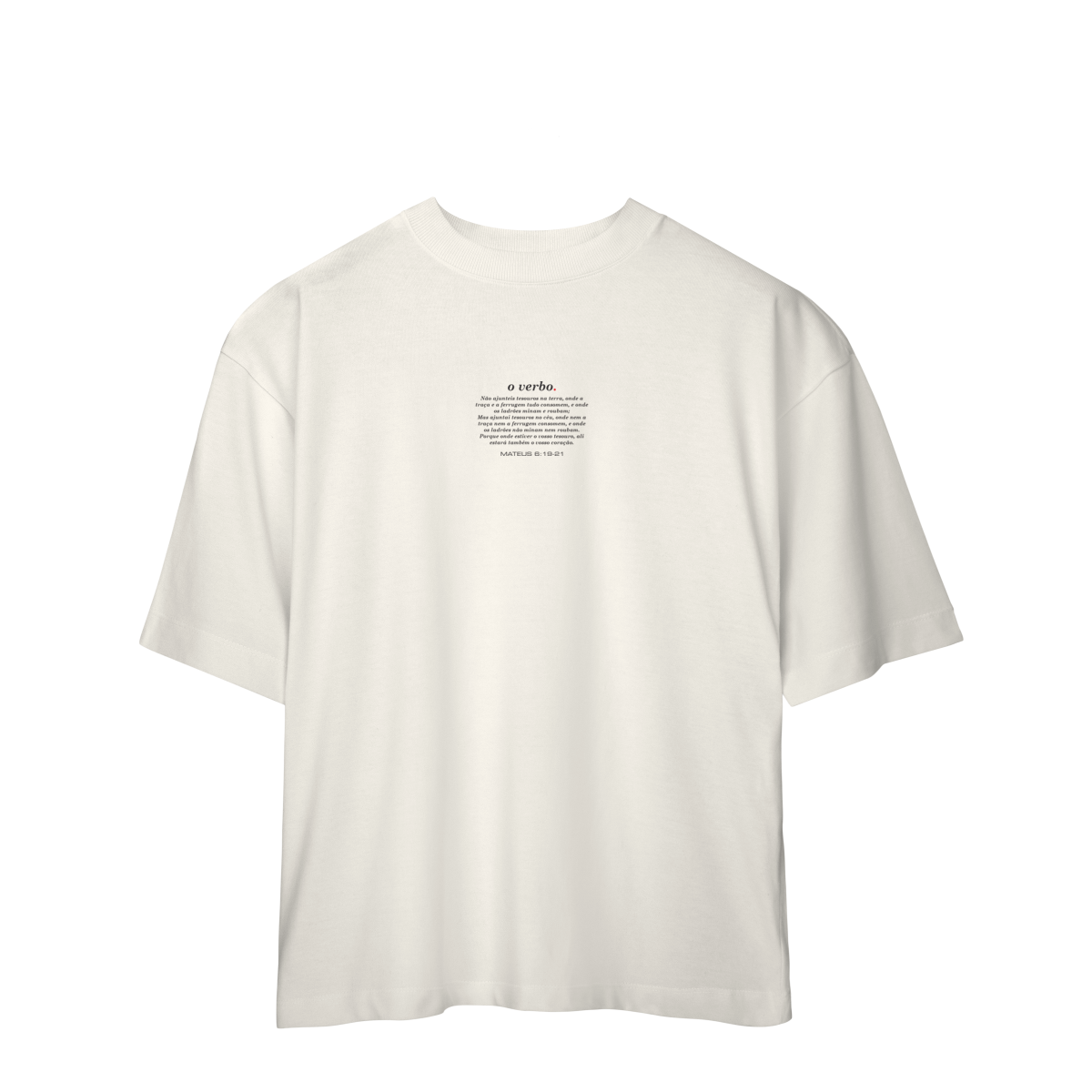 Na parte frontal, de forma discreta e elegante, o versículo Mateus 6:19–21 convida à reflexão sobre onde colocamos nosso coração e nossa verdadeira confiança.