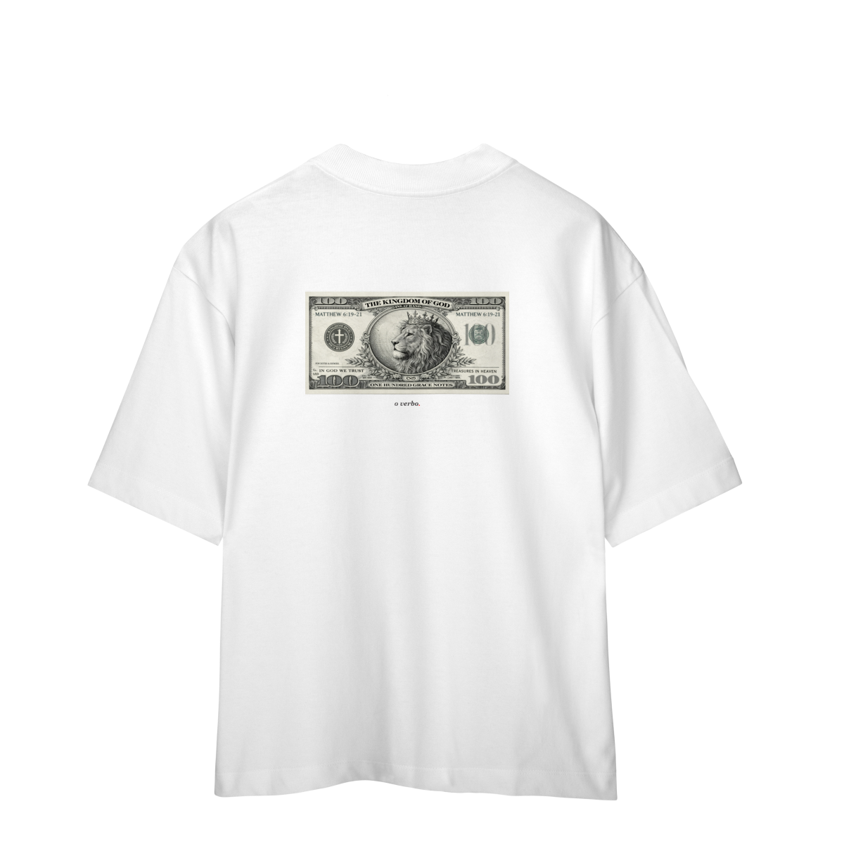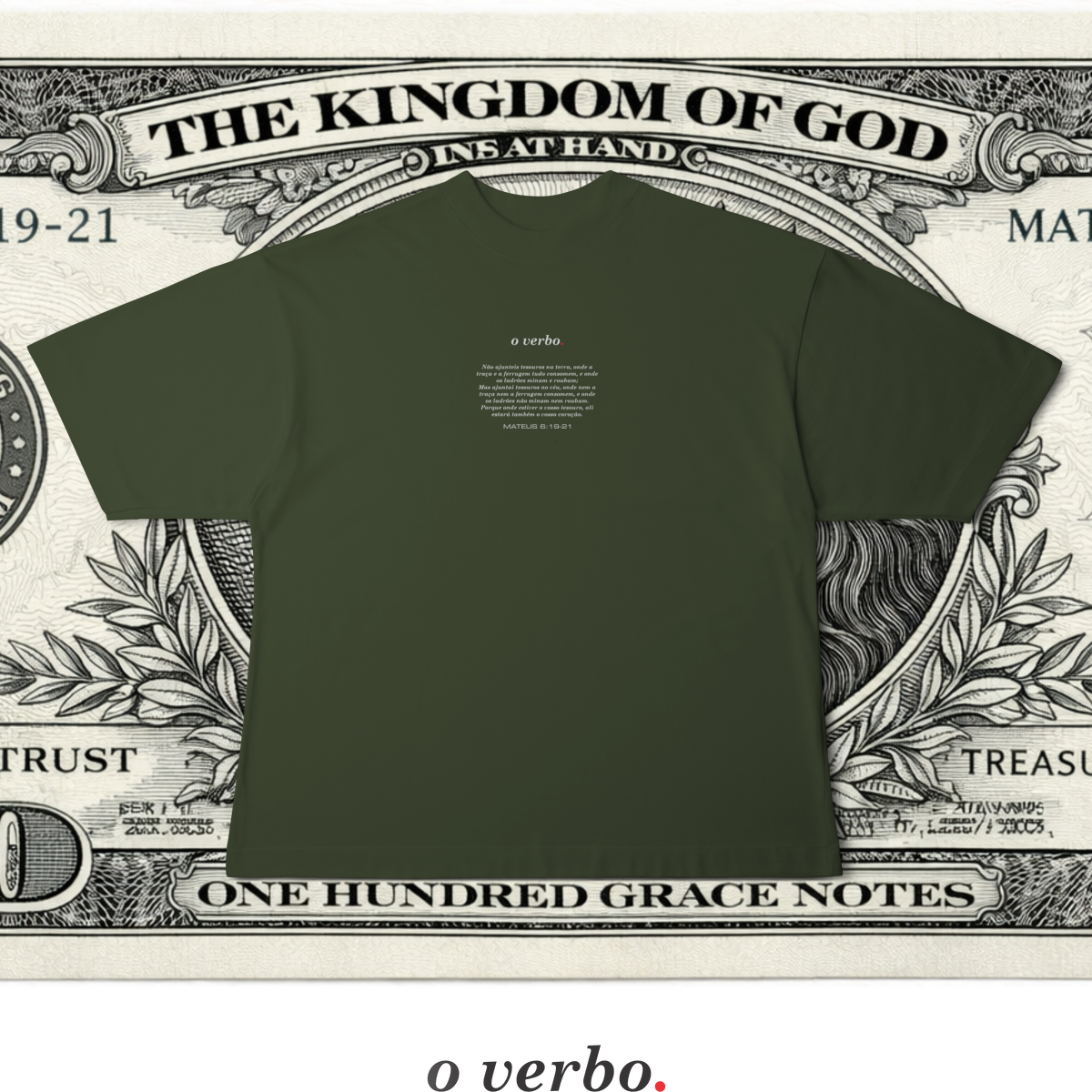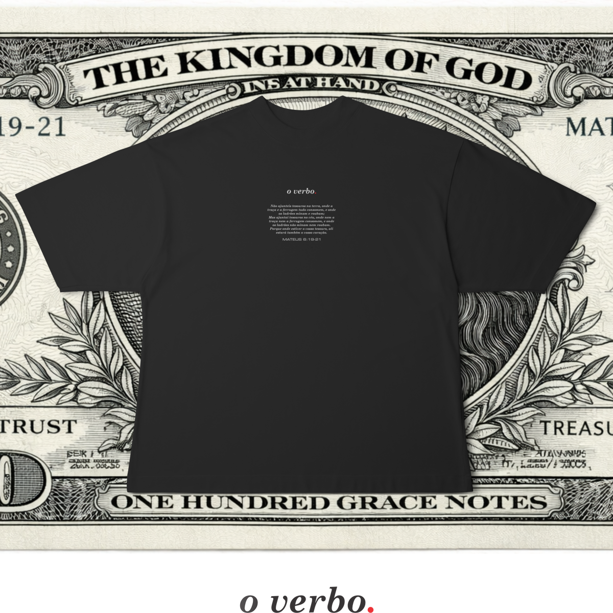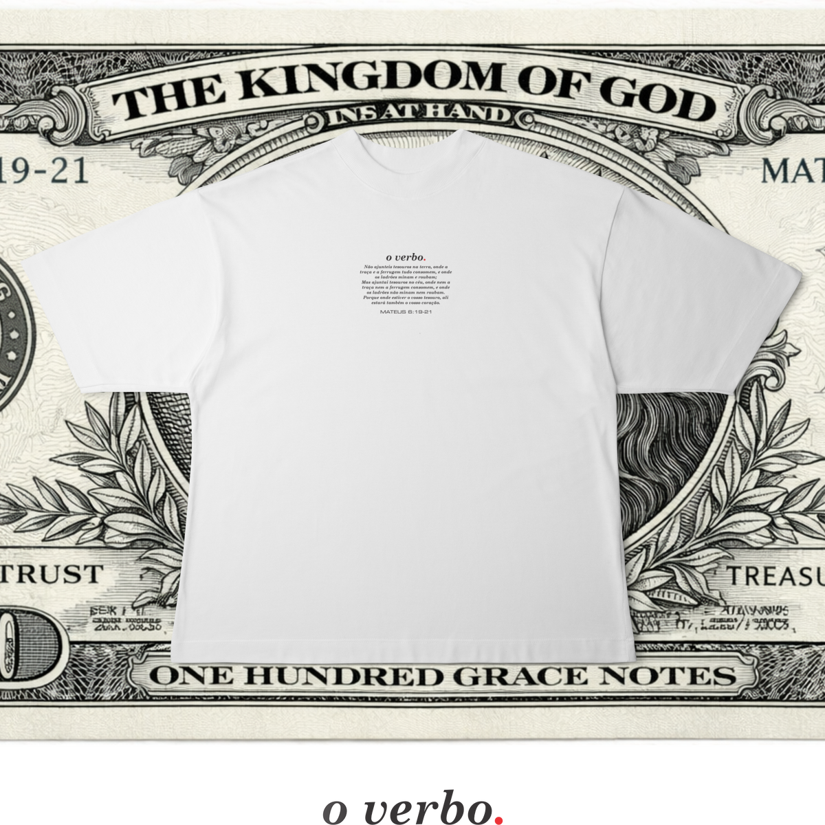 Na parte frontal, de forma discreta e elegante, o versículo Mateus 6:19–21 convida à reflexão sobre onde colocamos nosso coração e nossa verdadeira confiança.