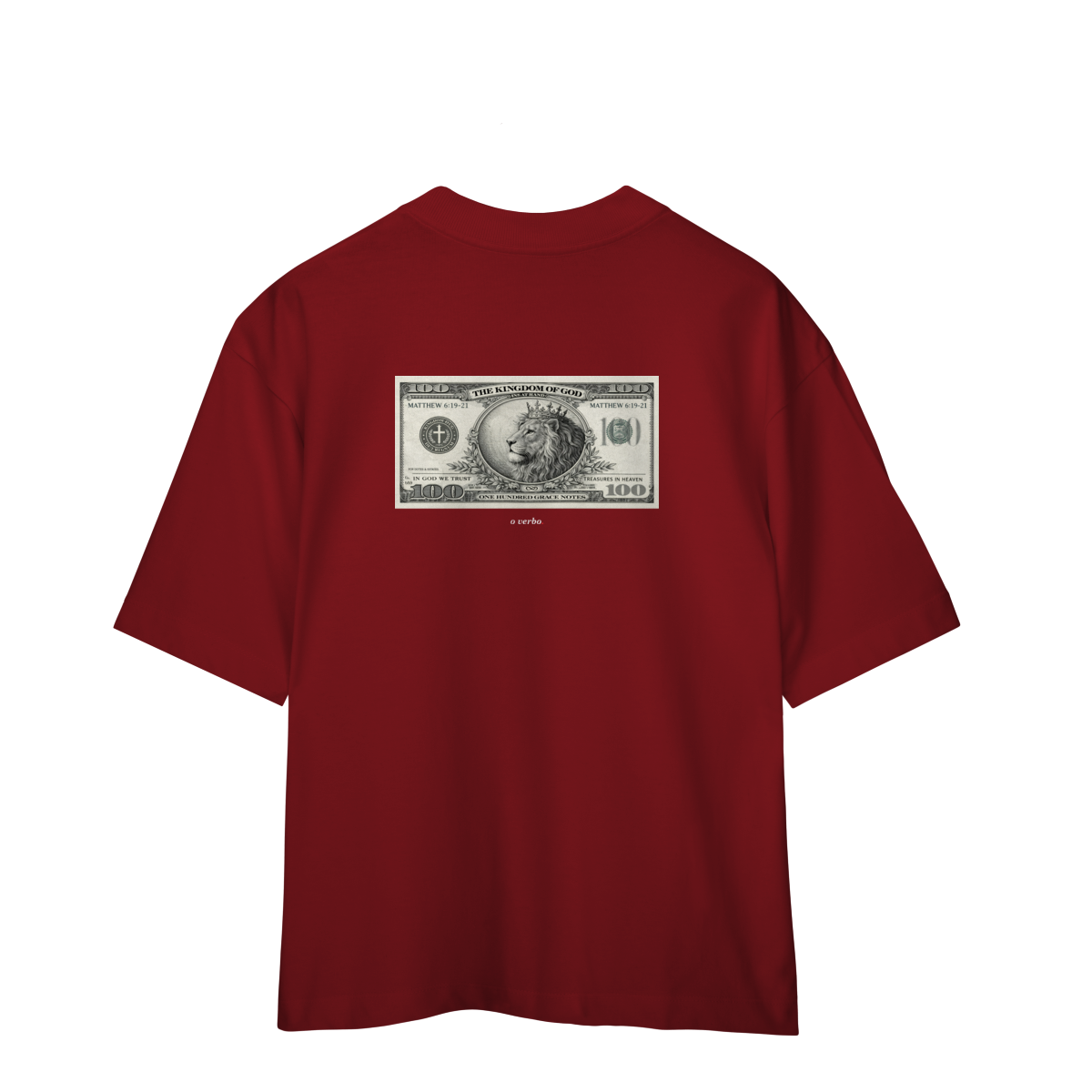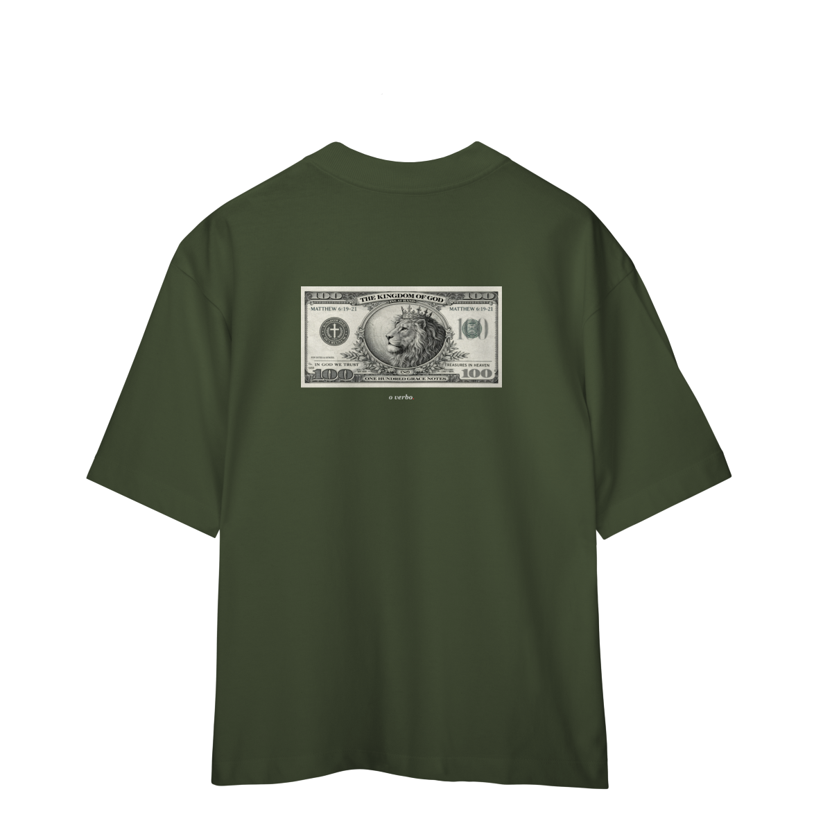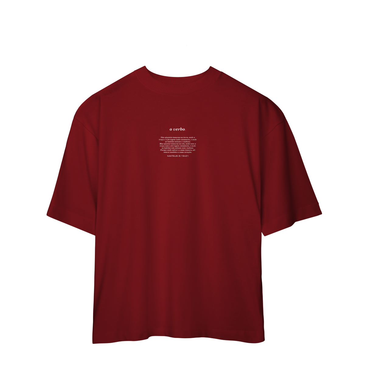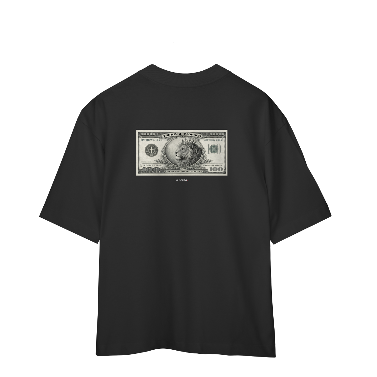 Na parte frontal, de forma discreta e elegante, o versículo Mateus 6:19–21 convida à reflexão sobre onde colocamos nosso coração e nossa verdadeira confiança.